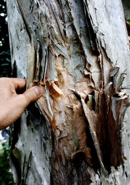 The bark grey-white and peeling in papery sheets that persist in layers on the trunk.